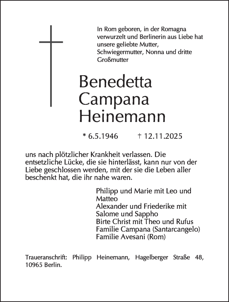 Hier finden Sie alle Traueranzeigen aus der Zeitung, die bisher für Benedetta Heinemann erschienen sind. Weitere Traueranzeigen, die in der Zeitung erscheinen, werden hier ebenfalls aufgelistet