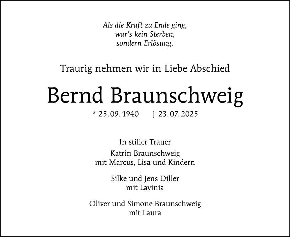 Hier finden Sie alle Traueranzeigen aus der Zeitung, die bisher für Bernd Braunschweig erschienen sind. Weitere Traueranzeigen, die in der Zeitung erscheinen, werden hier ebenfalls aufgelistet
