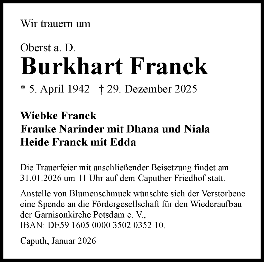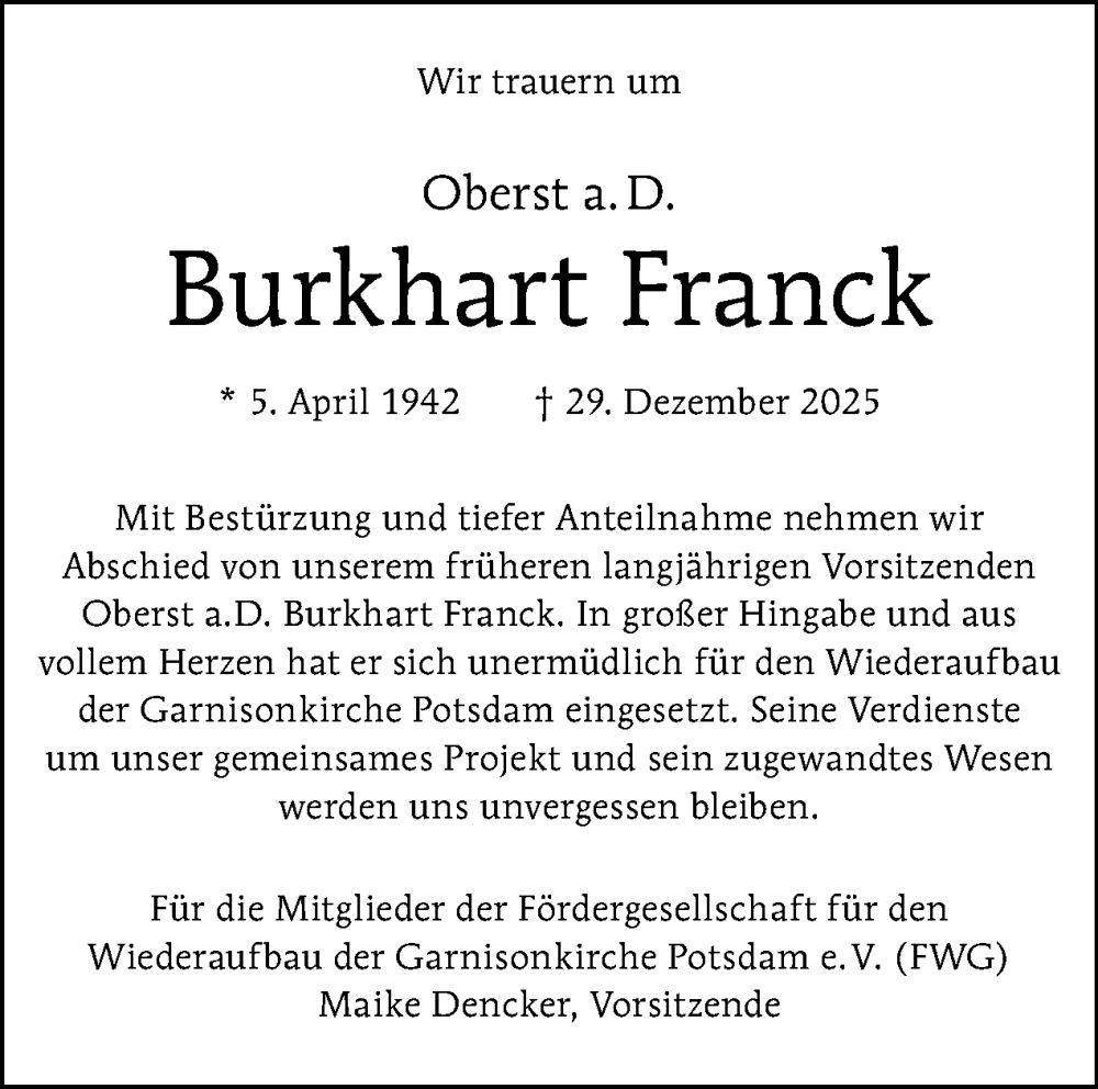Hier finden Sie alle Traueranzeigen aus der Zeitung, die bisher für Burkhart Franck erschienen sind. Weitere Traueranzeigen, die in der Zeitung erscheinen, werden hier ebenfalls aufgelistet