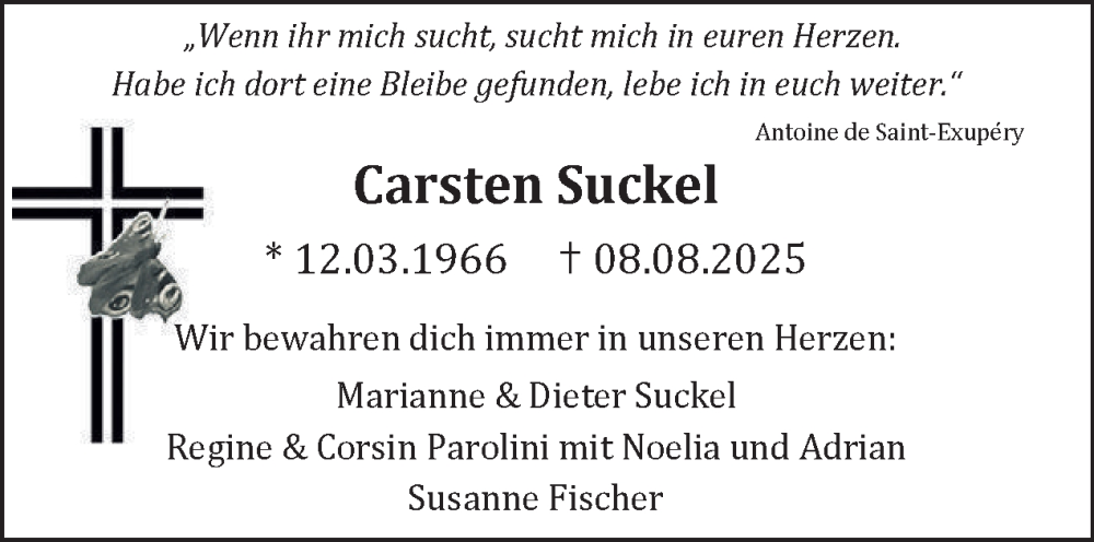 Hier finden Sie alle Traueranzeigen aus der Zeitung, die bisher für Carsten Suckel erschienen sind. Weitere Traueranzeigen, die in der Zeitung erscheinen, werden hier ebenfalls aufgelistet