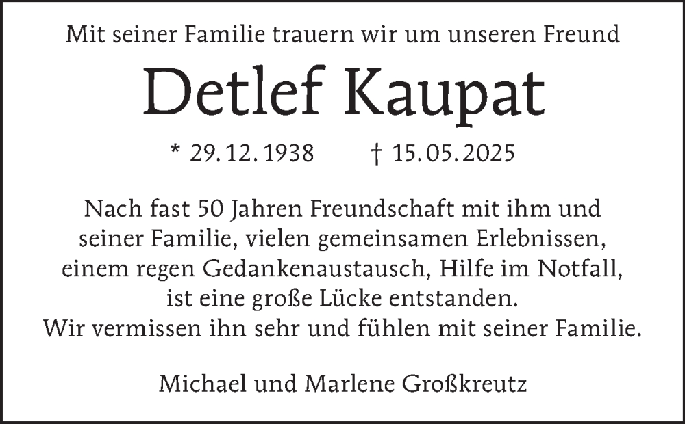 Hier finden Sie alle Traueranzeigen aus der Zeitung, die bisher für Detlef Kaupat erschienen sind. Weitere Traueranzeigen, die in der Zeitung erscheinen, werden hier ebenfalls aufgelistet