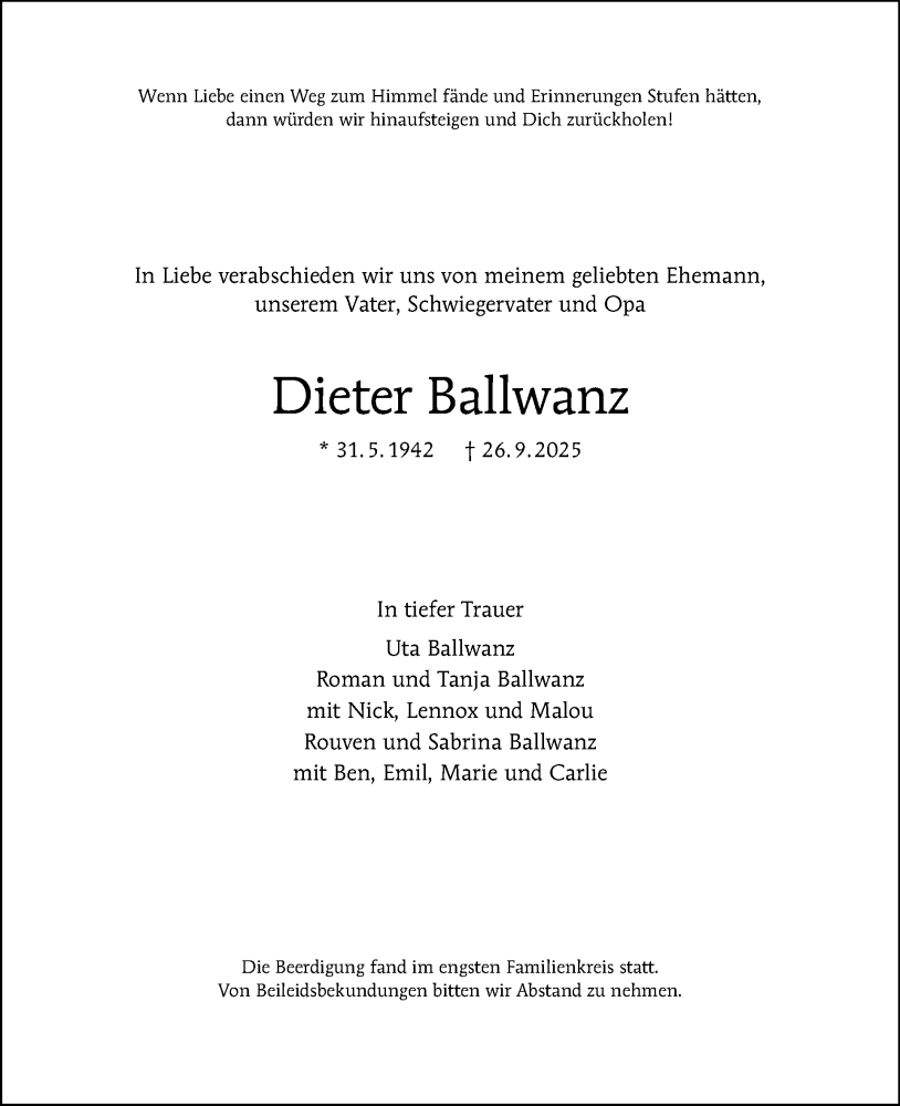 Hier finden Sie alle Traueranzeigen aus der Zeitung, die bisher für Dieter Ballwanz erschienen sind. Weitere Traueranzeigen, die in der Zeitung erscheinen, werden hier ebenfalls aufgelistet