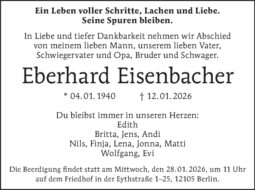 Hier finden Sie alle Traueranzeigen aus der Zeitung, die bisher für Eberhard Eisenbacher erschienen sind. Weitere Traueranzeigen, die in der Zeitung erscheinen, werden hier ebenfalls aufgelistet
