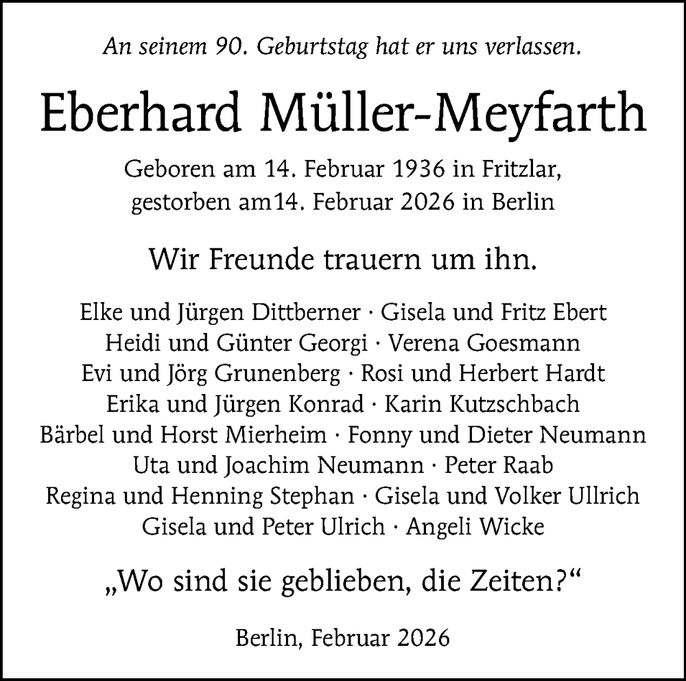 Hier finden Sie alle Traueranzeigen aus der Zeitung, die bisher für Eberhard Müller-Meyfarth erschienen sind. Weitere Traueranzeigen, die in der Zeitung erscheinen, werden hier ebenfalls aufgelistet
