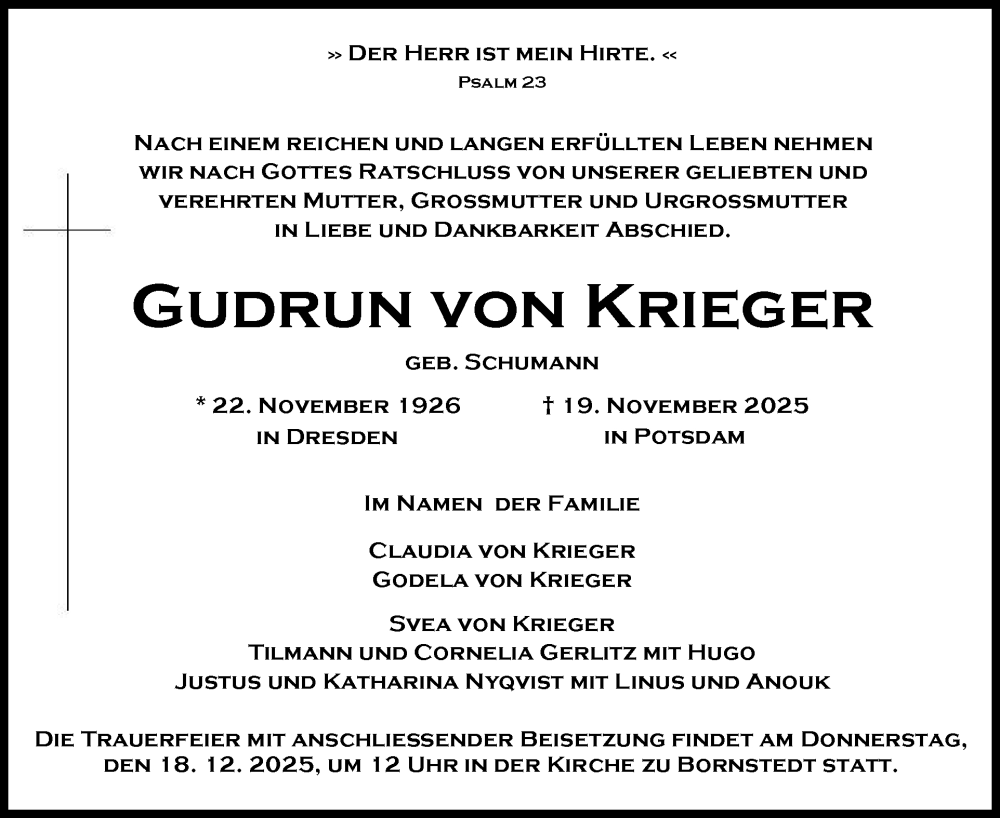Hier finden Sie alle Traueranzeigen aus der Zeitung, die bisher für Gudrun von Krieger erschienen sind. Weitere Traueranzeigen, die in der Zeitung erscheinen, werden hier ebenfalls aufgelistet
