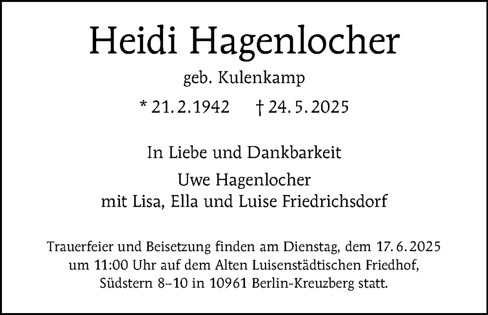 Hier finden Sie alle Traueranzeigen aus der Zeitung, die bisher für Heidi Hagenlocher erschienen sind. Weitere Traueranzeigen, die in der Zeitung erscheinen, werden hier ebenfalls aufgelistet