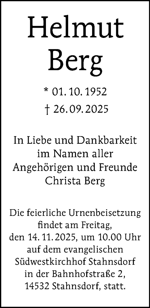 Hier finden Sie alle Traueranzeigen aus der Zeitung, die bisher für Helmut Berg erschienen sind. Weitere Traueranzeigen, die in der Zeitung erscheinen, werden hier ebenfalls aufgelistet