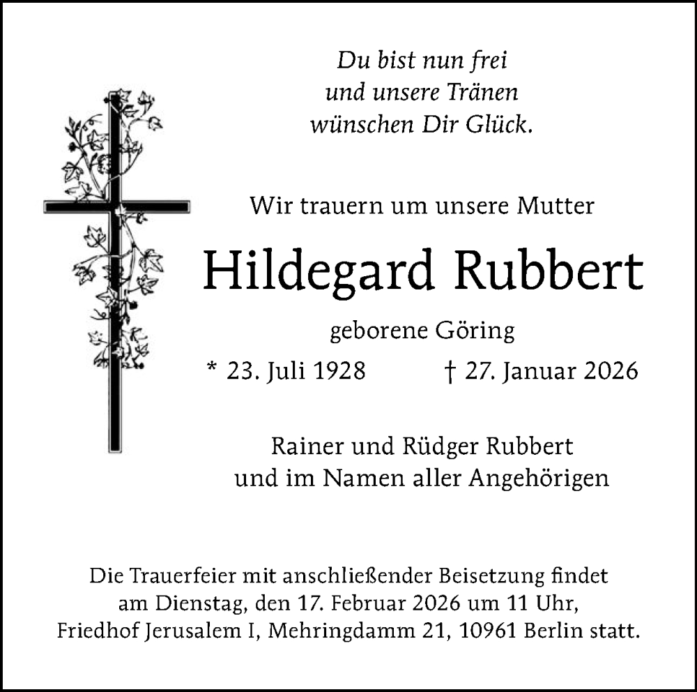 Hier finden Sie alle Traueranzeigen aus der Zeitung, die bisher für Hildegard Rubbert erschienen sind. Weitere Traueranzeigen, die in der Zeitung erscheinen, werden hier ebenfalls aufgelistet
