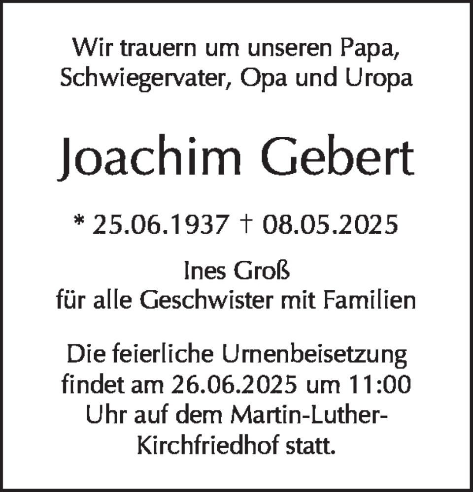 Hier finden Sie alle Traueranzeigen aus der Zeitung, die bisher für Joachim Gebert erschienen sind. Weitere Traueranzeigen, die in der Zeitung erscheinen, werden hier ebenfalls aufgelistet