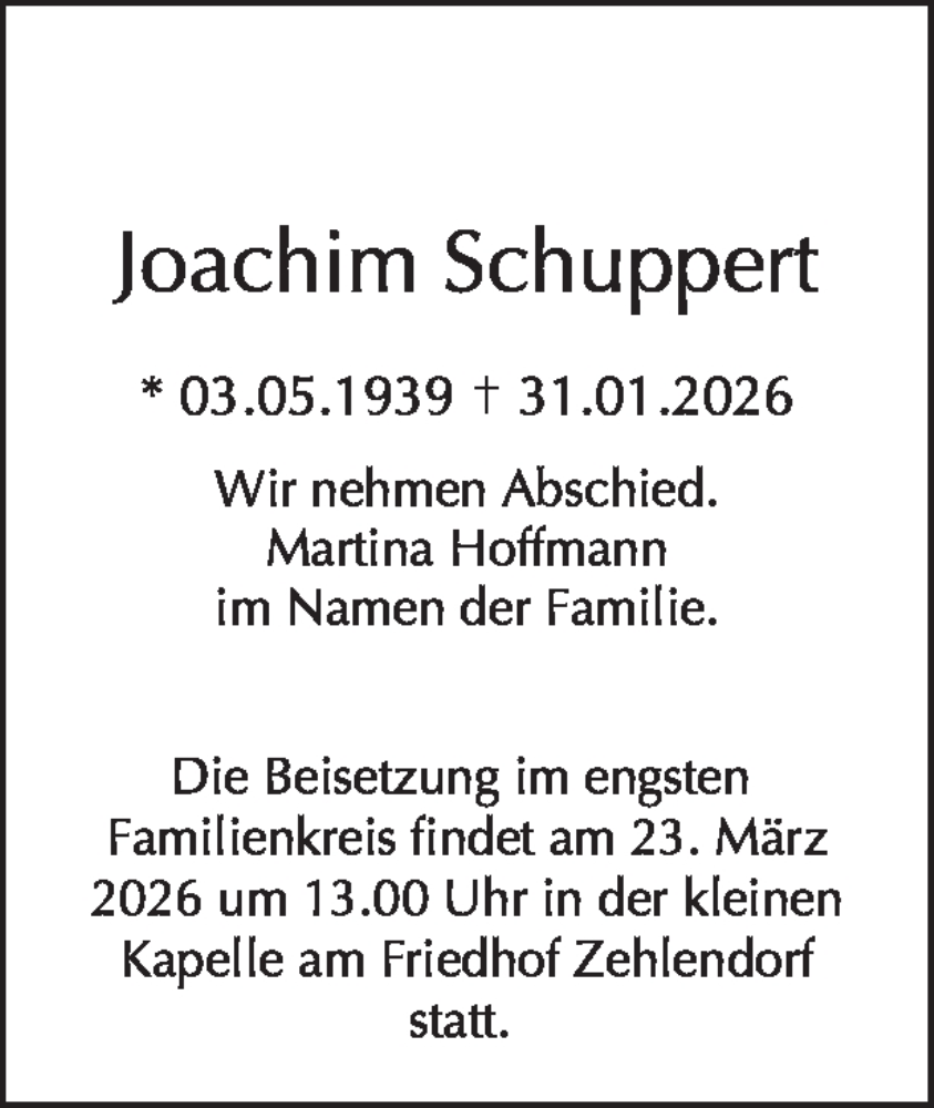 Hier finden Sie alle Traueranzeigen aus der Zeitung, die bisher für Joachim Schuppert erschienen sind. Weitere Traueranzeigen, die in der Zeitung erscheinen, werden hier ebenfalls aufgelistet