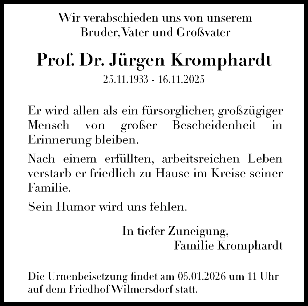 Hier finden Sie alle Traueranzeigen aus der Zeitung, die bisher für Jürgen Kromphardt erschienen sind. Weitere Traueranzeigen, die in der Zeitung erscheinen, werden hier ebenfalls aufgelistet