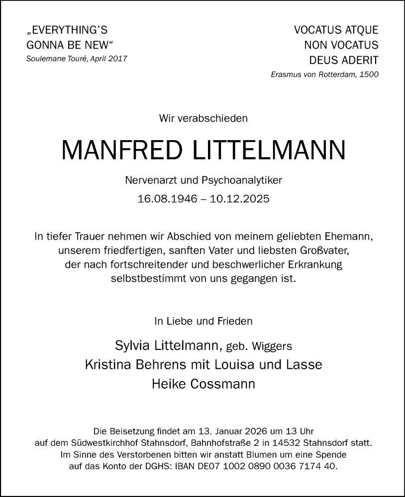 Hier finden Sie alle Traueranzeigen aus der Zeitung, die bisher für Manfred Littelmann erschienen sind. Weitere Traueranzeigen, die in der Zeitung erscheinen, werden hier ebenfalls aufgelistet
