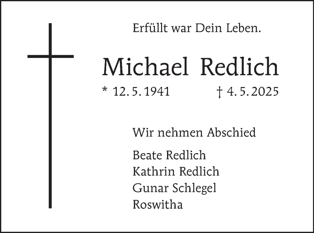 Hier finden Sie alle Traueranzeigen aus der Zeitung, die bisher für Michael Redlich erschienen sind. Weitere Traueranzeigen, die in der Zeitung erscheinen, werden hier ebenfalls aufgelistet