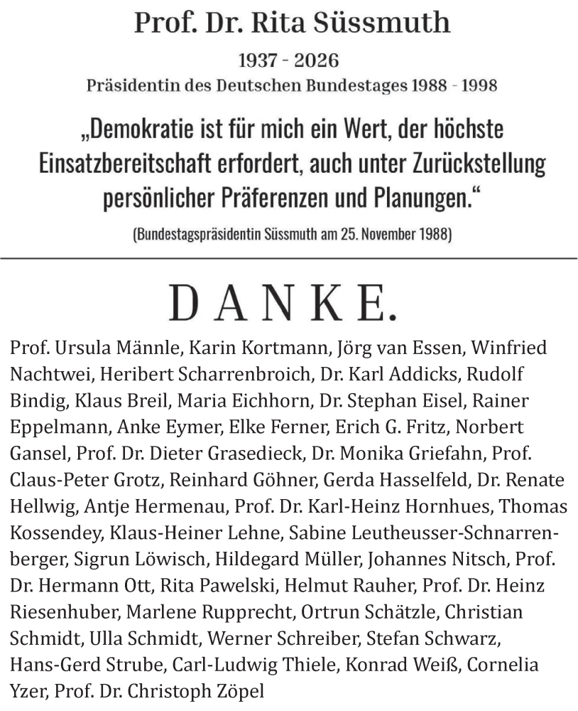 Hier finden Sie alle Traueranzeigen aus der Zeitung, die bisher für Rita Süssmuth erschienen sind. Weitere Traueranzeigen, die in der Zeitung erscheinen, werden hier ebenfalls aufgelistet