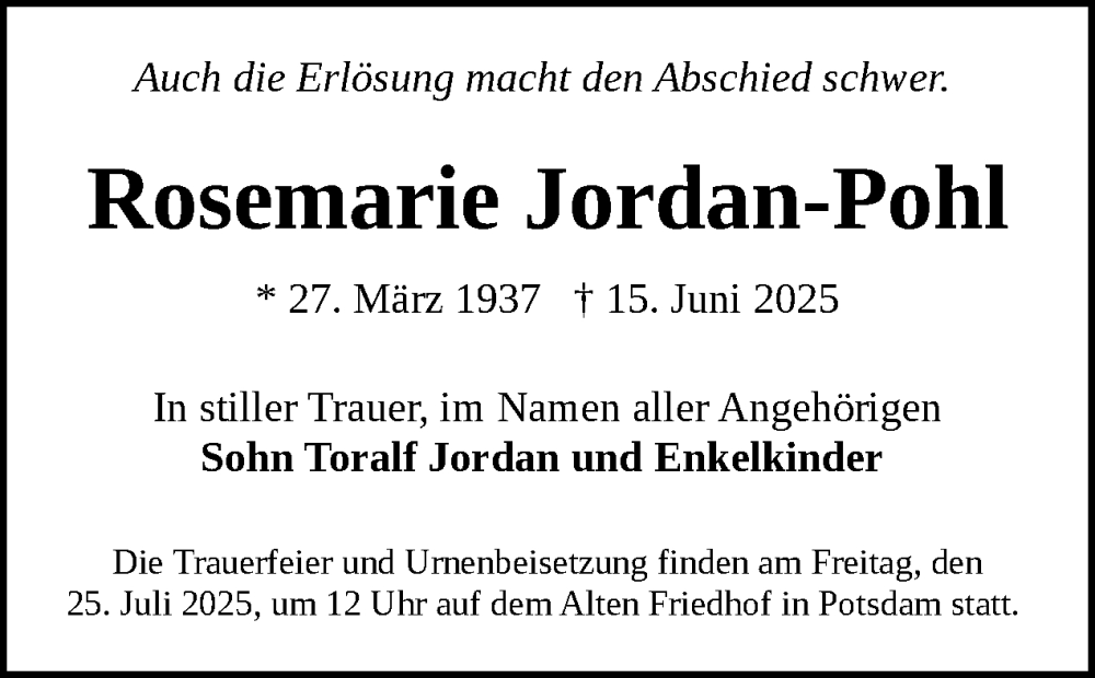 Hier finden Sie alle Traueranzeigen aus der Zeitung, die bisher für Rosemarie Jordan-Pohl erschienen sind. Weitere Traueranzeigen, die in der Zeitung erscheinen, werden hier ebenfalls aufgelistet