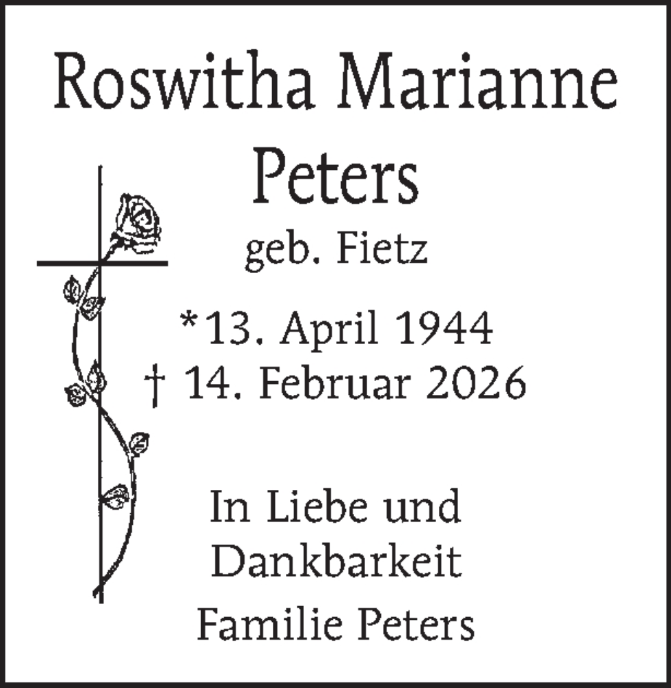 Hier finden Sie alle Traueranzeigen aus der Zeitung, die bisher für Roswitha Marianne Peters erschienen sind. Weitere Traueranzeigen, die in der Zeitung erscheinen, werden hier ebenfalls aufgelistet