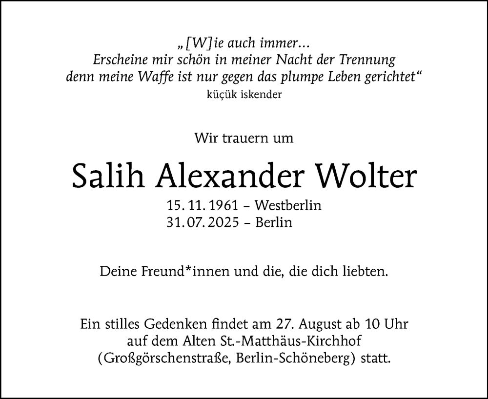 Hier finden Sie alle Traueranzeigen aus der Zeitung, die bisher für Salih Alexander Wolter erschienen sind. Weitere Traueranzeigen, die in der Zeitung erscheinen, werden hier ebenfalls aufgelistet