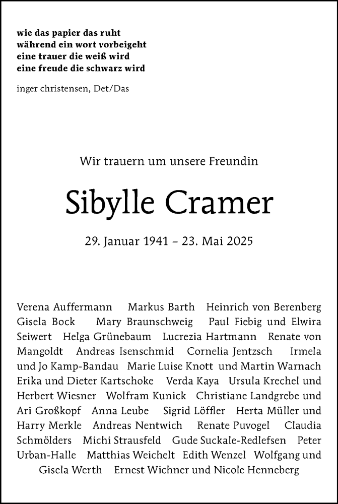 Hier finden Sie alle Traueranzeigen aus der Zeitung, die bisher für Sibylle Cramer erschienen sind. Weitere Traueranzeigen, die in der Zeitung erscheinen, werden hier ebenfalls aufgelistet