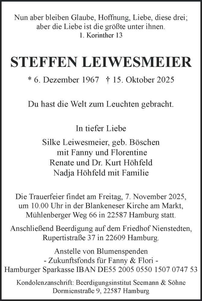 Hier finden Sie alle Traueranzeigen aus der Zeitung, die bisher für Steffen Leiwesmeier erschienen sind. Weitere Traueranzeigen, die in der Zeitung erscheinen, werden hier ebenfalls aufgelistet