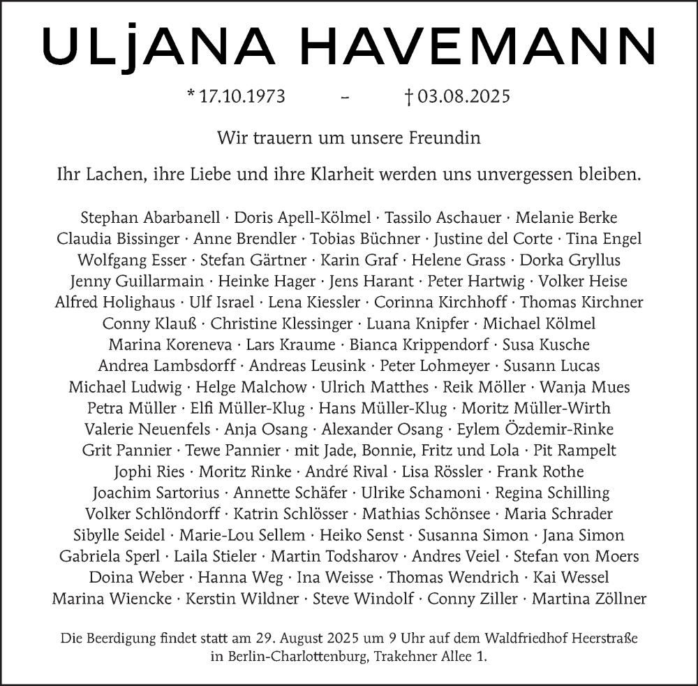 Hier finden Sie alle Traueranzeigen aus der Zeitung, die bisher für Uljana Havemann erschienen sind. Weitere Traueranzeigen, die in der Zeitung erscheinen, werden hier ebenfalls aufgelistet