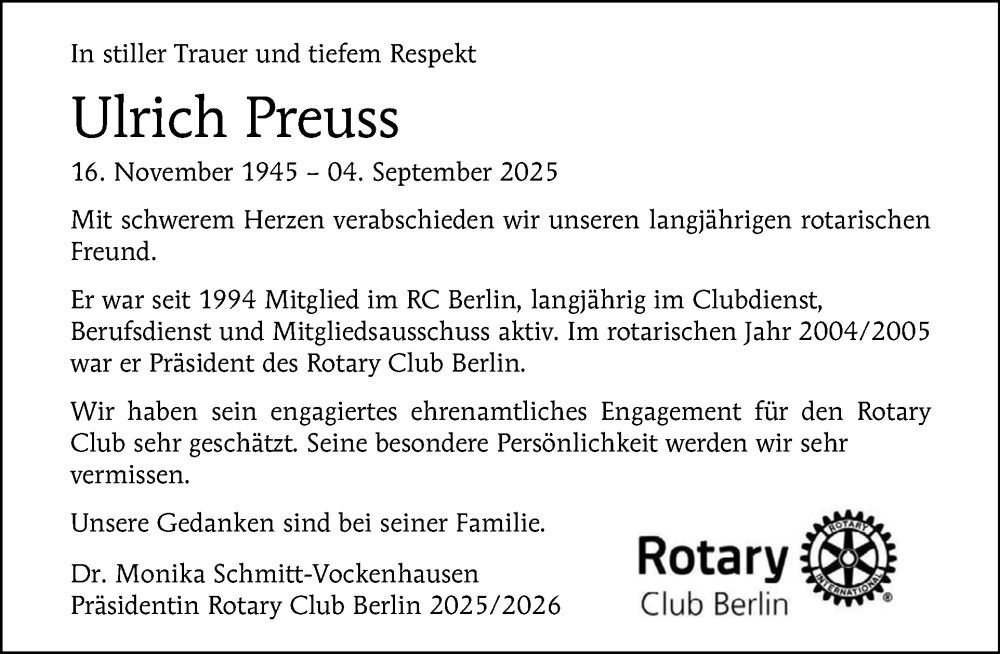 Hier finden Sie alle Traueranzeigen aus der Zeitung, die bisher für Ulrich Preuß erschienen sind. Weitere Traueranzeigen, die in der Zeitung erscheinen, werden hier ebenfalls aufgelistet