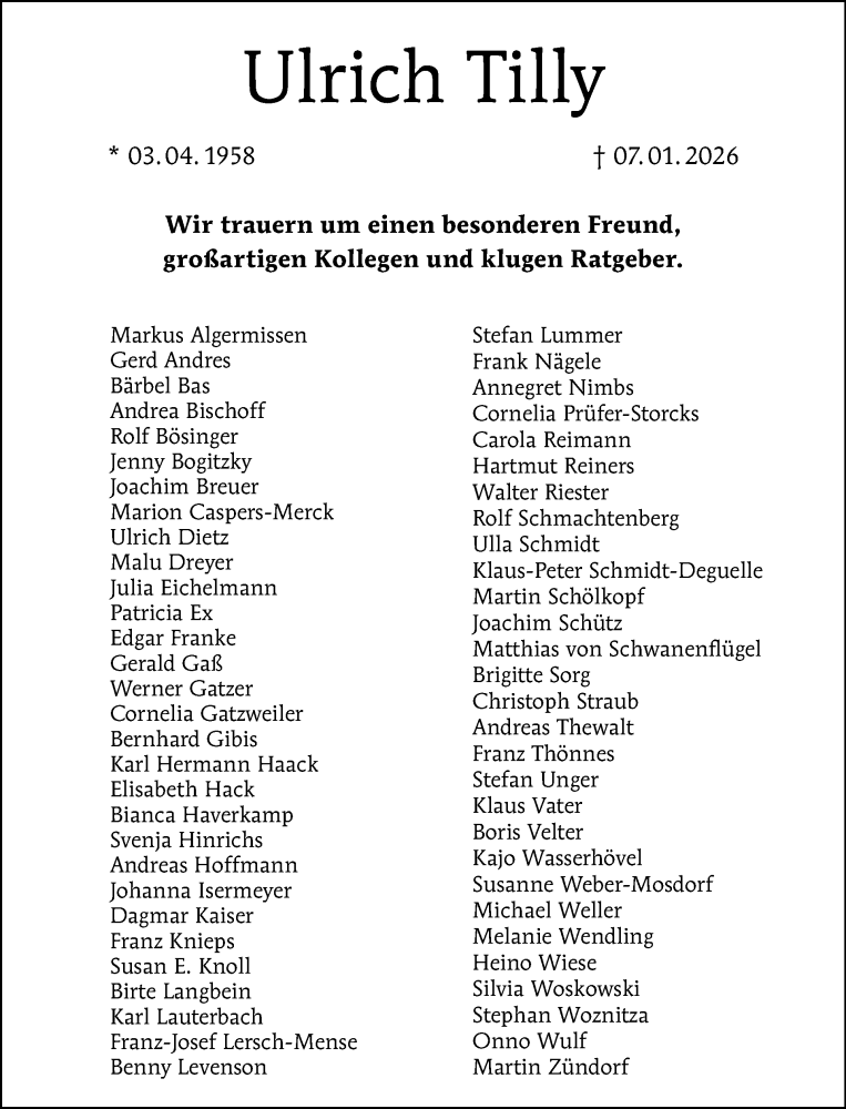 Hier finden Sie alle Traueranzeigen aus der Zeitung, die bisher für Ulrich Tilly erschienen sind. Weitere Traueranzeigen, die in der Zeitung erscheinen, werden hier ebenfalls aufgelistet