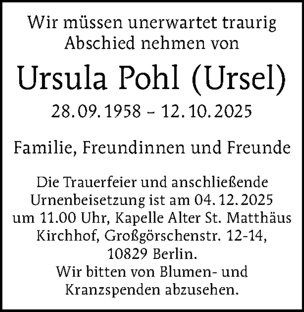 Hier finden Sie alle Traueranzeigen aus der Zeitung, die bisher für Ursula Pohl erschienen sind. Weitere Traueranzeigen, die in der Zeitung erscheinen, werden hier ebenfalls aufgelistet