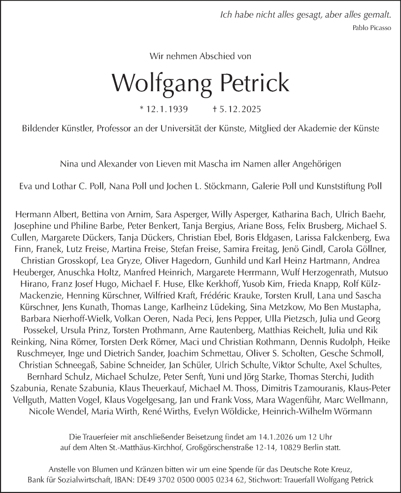 Hier finden Sie alle Traueranzeigen aus der Zeitung, die bisher für Wolfgang Petrick erschienen sind. Weitere Traueranzeigen, die in der Zeitung erscheinen, werden hier ebenfalls aufgelistet