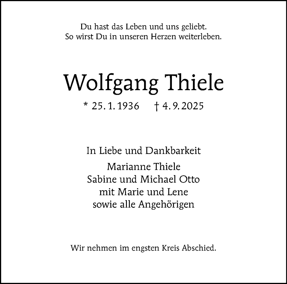 Hier finden Sie alle Traueranzeigen aus der Zeitung, die bisher für Wolfgang Thiele erschienen sind. Weitere Traueranzeigen, die in der Zeitung erscheinen, werden hier ebenfalls aufgelistet